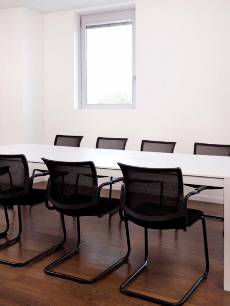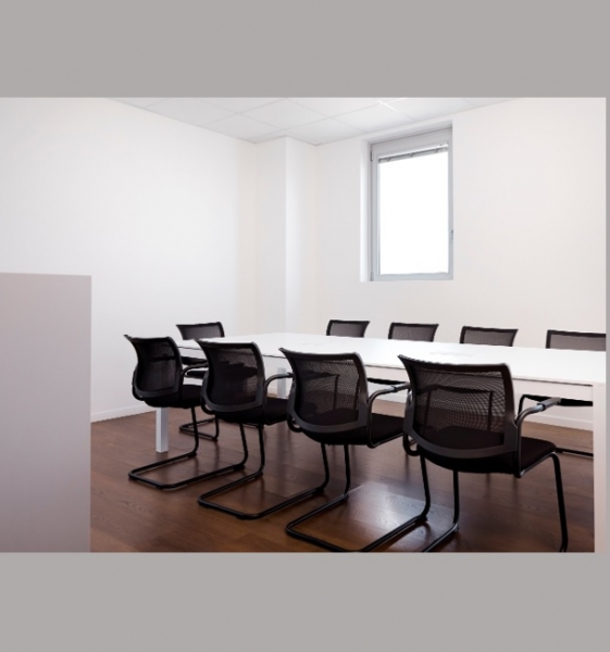 Sala riunioni con grande tavolo modello Zefiro X total white con 2 passacavi centrali e sedute nere in rete.