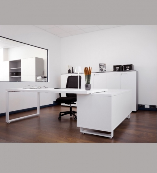 Ufficio direzionale Archimede total white con contenitore inferiore laterale e cassettiera nascosta.