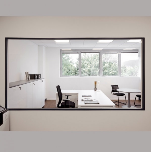 Mobile con ante a mezza altezza con scocca grigia e ante bianche per creare movimento all’ufficio.