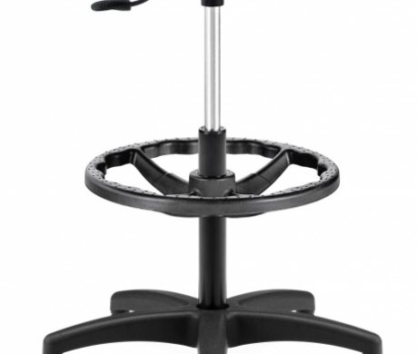 Sgabello Practica con base a 5 razze in nylon nero e ruote. Sedile in tondino di faggio, regolazione in altezza a gas e poggiapiedi.